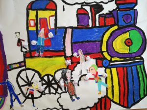 U 3.b razred dojurio je vlak koji je dio interpretacije lektirnoga djela Mate Lovraka: Vlak u snijegu. Učenici su na velikom formatu, u skupini, naslikali vlak koji velikom brzinom juri našim zavičajem. Da grudanje može biti i u toplom okružju razreda, pokazali su slikanjem prijatelja i sebe u pokretima i zahvatima grudanja. Gotove likove postavili smo uz vlak te dodali snježne grude koje su poput pravih. Hura, grudanje je moglo početi!