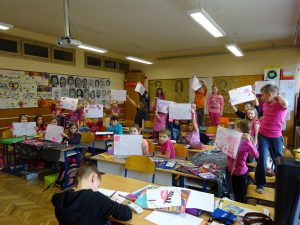 Srijeda. Posljednja srijeda u veljači. Uobičajena buka i galama prije školskoga zvona. Ušli smo u školu i dogodilo se nešto neobično. Hodnici naše škole odjednom su postali ružičasti. Učenici su odjenuli ružičaste majice ili su imali neki ružičasti detalj u znak potpore Danu ružičastih majica, odnosno potpori protiv vršnjačkoga nasilja. Učenici a smjene nižih razreda sa svojim su učiteljicama imali različite radionice. Majice s porukama, koje su izradili, našle su se u holu, na vratima i prozorima naše škole. Pri izradi majica s porukama razgovarali smo na koji način zaustaviti vršnjačko nasilje i kako se nositi s tim.